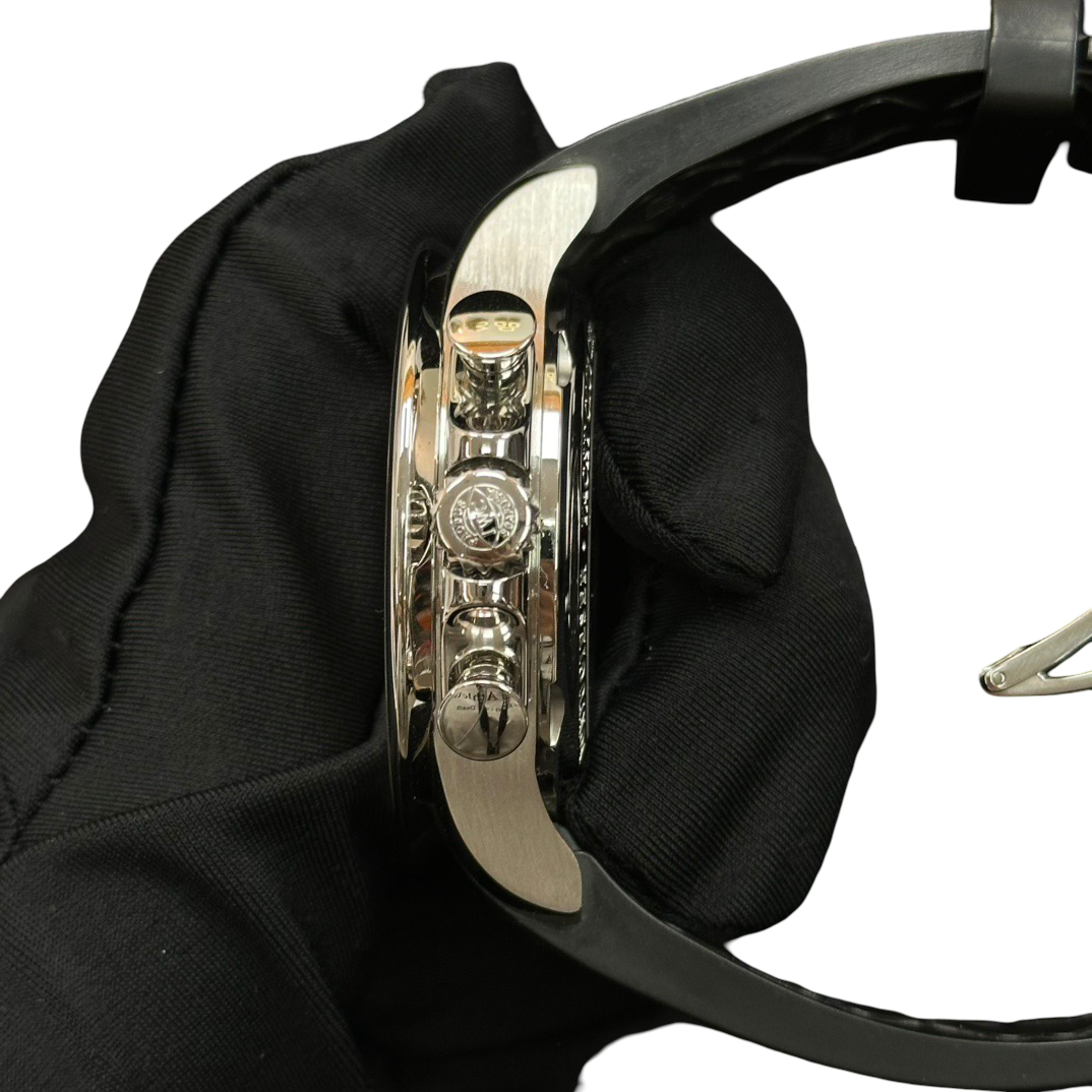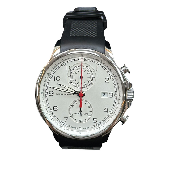 The IWC Portugieser Yacht Club Chronograph fuses maritime flair with cutting-edge Swiss craftsmanship. Housed in a 45.4mm stainless steel case with a striking silver dial, this watch combines a chronograph, date function, and vivid red highlights for a bold, dynamic style. Driven by an automatic movement, it guarantees precision and resilience.